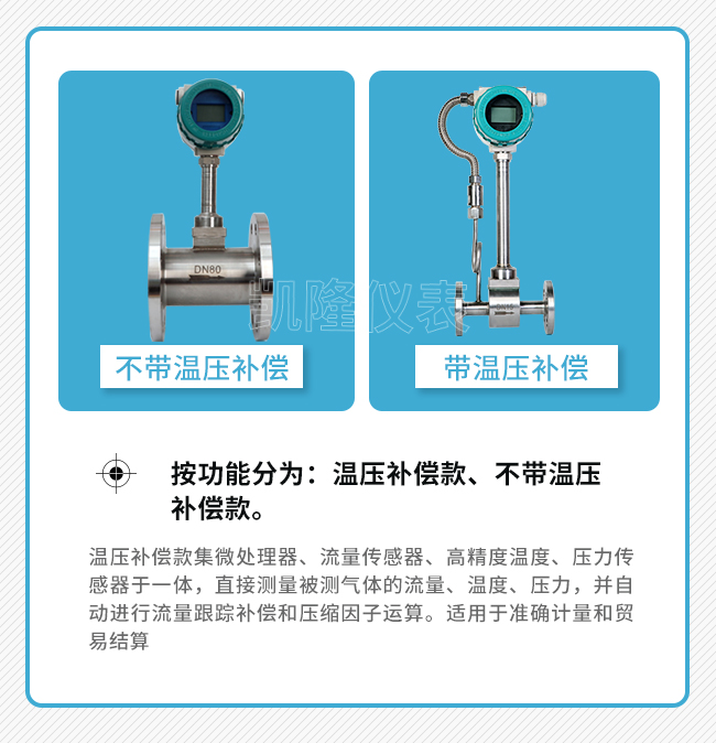 LUGB型溫壓補償渦街流量計分為一體式溫壓補償和分體式溫壓補償兩種。